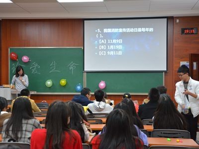 紧接着,为了活跃班会气氛,主持人宣布开展了第一轮“安全知识抢答”活动。“在游泳时肌肉抽筋采取自救办法不恰当的是:A、头后仰……”主持人话音未落,广电一班的姜晓源同学就迅速站起抢答:“D!”“回答正确!”台下的工作人员为姜晓源同学送上了小礼品作为奖励。在奖品的刺激下,同学们纷纷抢答,踊跃参与活动。